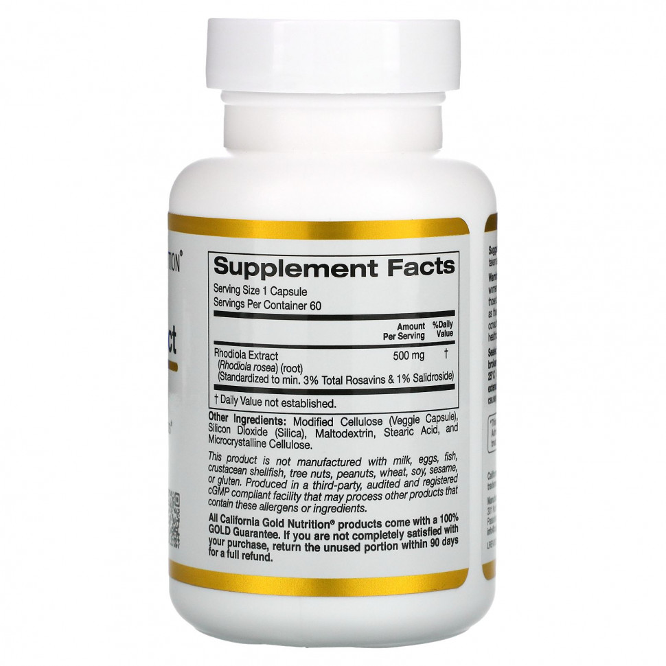 Экстракт родиолы от California Gold Nutrition содержит родиолу розовую (Rhodiola rosea), полученную из корня травы. Вегетарианские капсулы подходят для вегетарианцев и веганов и не содержат глютена, ГМО или сои.