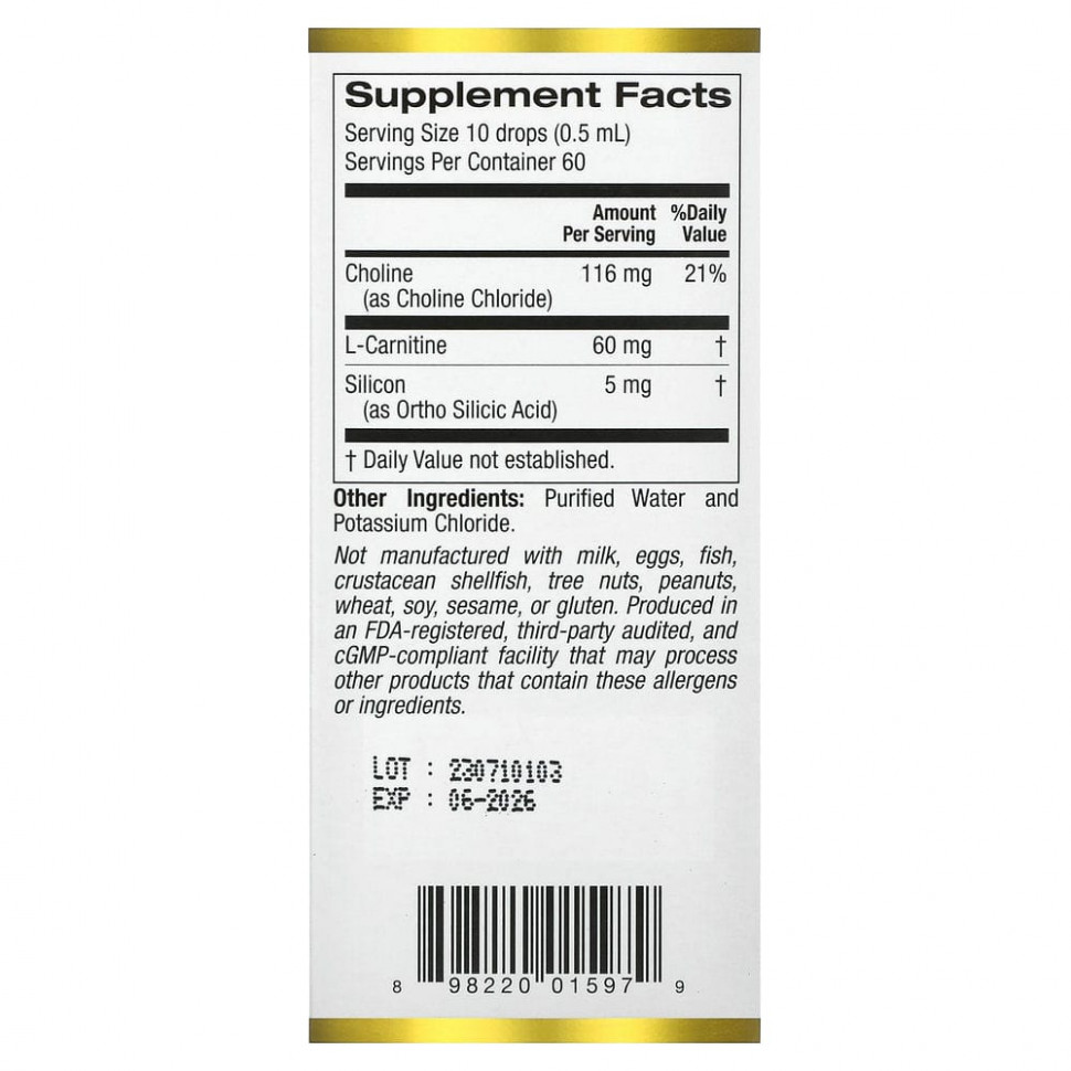 Холиновый и кремниевый комплексCalifornia Gold Nutrition содержит биологически доступную и стабилизированную форму кремния (ортокремниевую кислоту) в сочетании с холином и L-карнитином.
