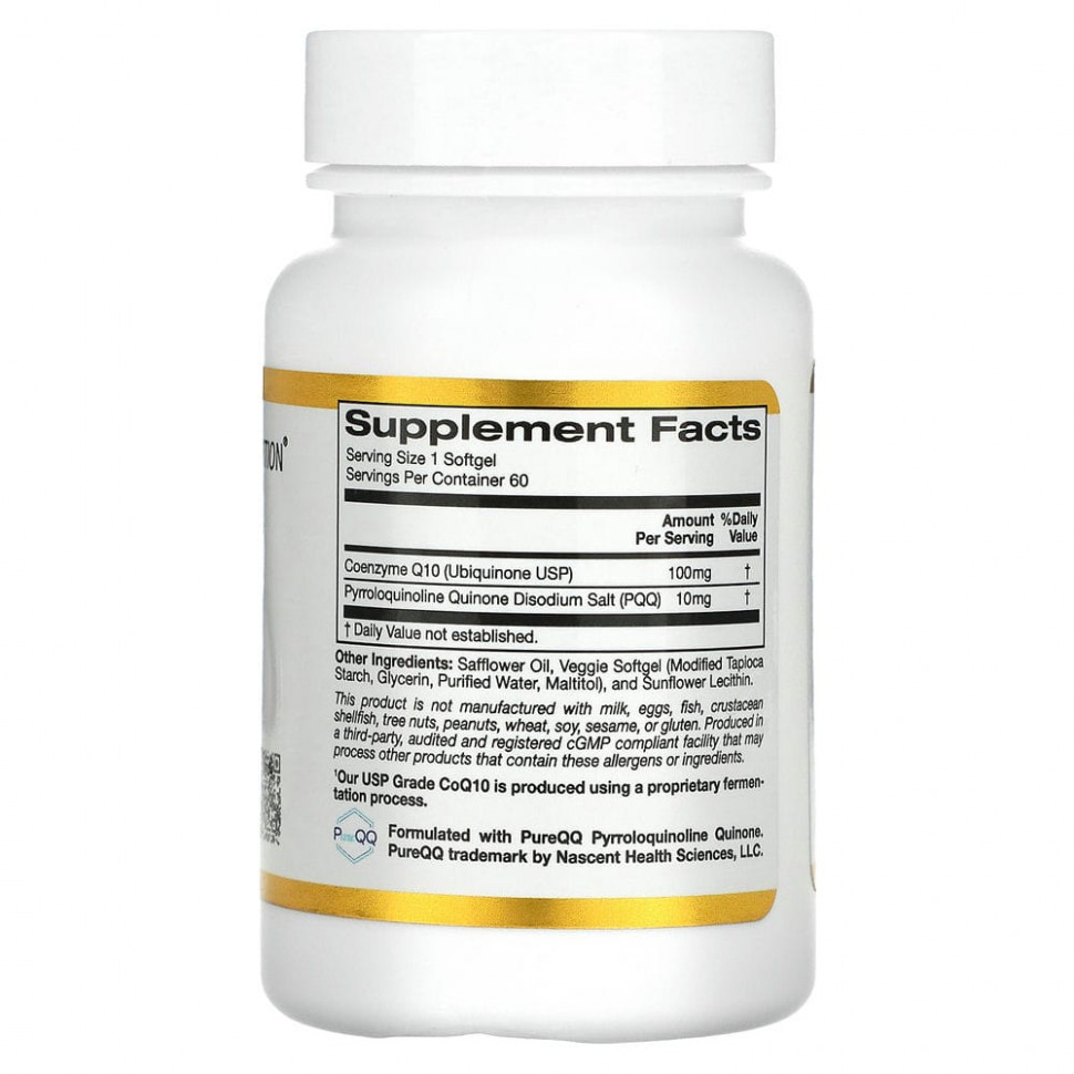 Коэнзим Q10 с пирролохинолинхиноном от California Gold Nutrition содержит коэнзим Q10 фармацевтической степени чистоты (USP), который производится с помощью запатентованного процесса ферментации, с пирролохинолинхиноном PureQQ® в растительных капсулах TapiOgels™ из тапиоки производства США.