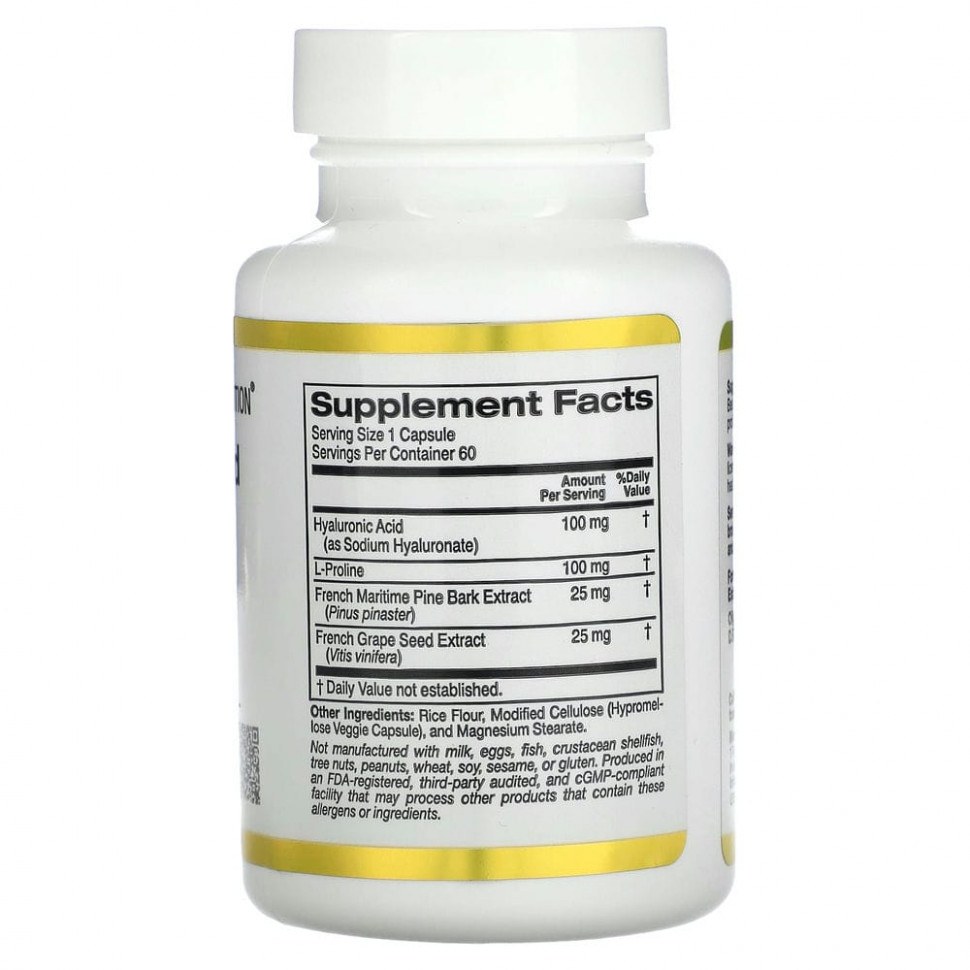 Комплекс с гиалуроновой кислотой California Gold Nutrition сочетает в себе жизненно важные структурные компоненты, источник L-пролина неживотного происхождения, необходимый для производства коллагена, а также экстракты коры сосны и виноградных косточек, оказывающие взаимно усиливающее действие.