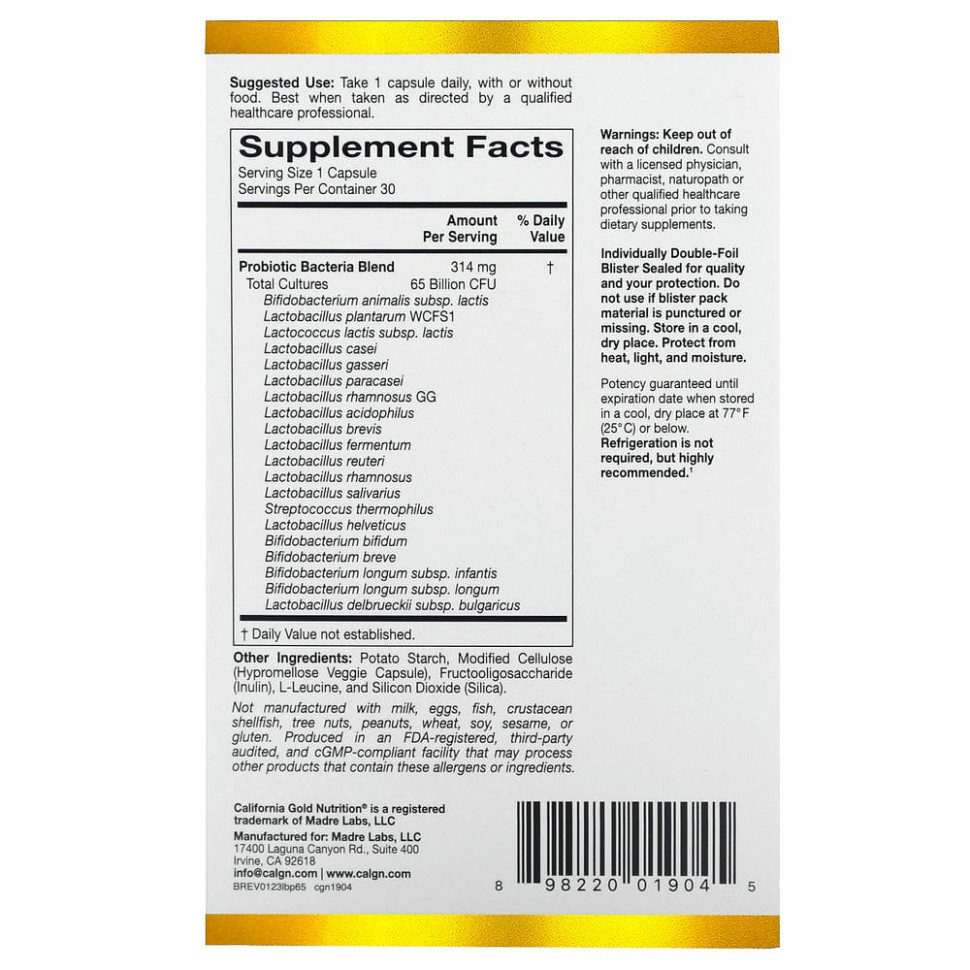 Пробиотики Lactobif® 65 от California Gold Nutrition содержат 20 активных штаммов пробиотиков, в том числе 15 штаммов молочнокислых бактерий и 5 штаммов бифидобактерий. Каждая вегетарианская капсула содержит 65 млрд КОЕ, чтобы доставлять в организм эффективное количество полезных бактерий и поддерживать нормальный микробный баланс.