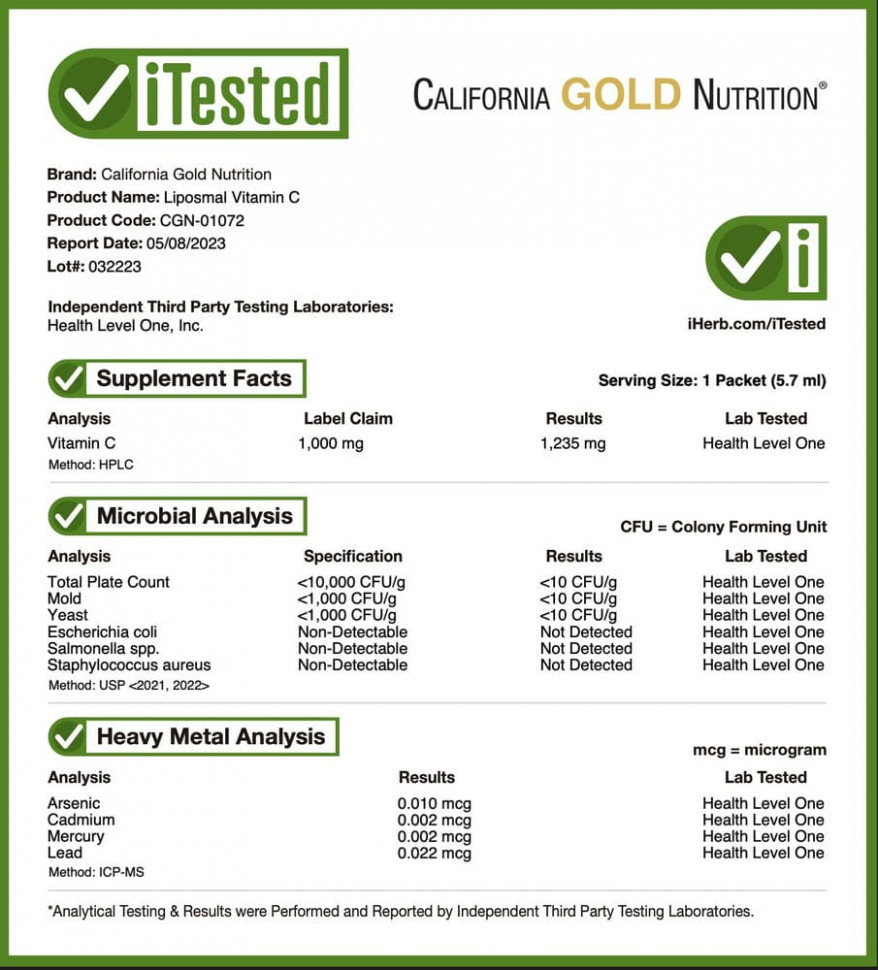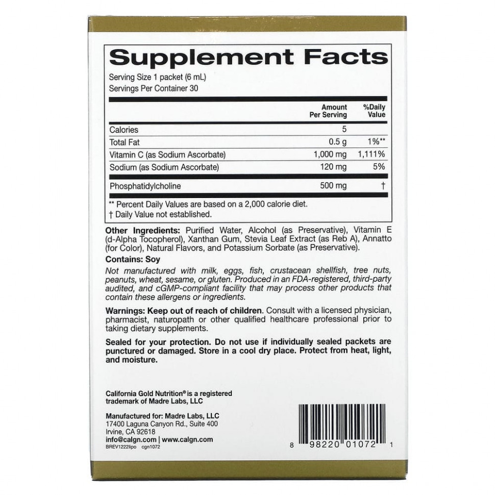 Липосомальный витамин C California Gold Nutrition производится по запатентованной формуле и представляет собой некислую буферизованную форму витамина C (аскорбат натрия) в составе фосфатидилхолинового комплекса фармацевтической степени чистоты из Германии.
