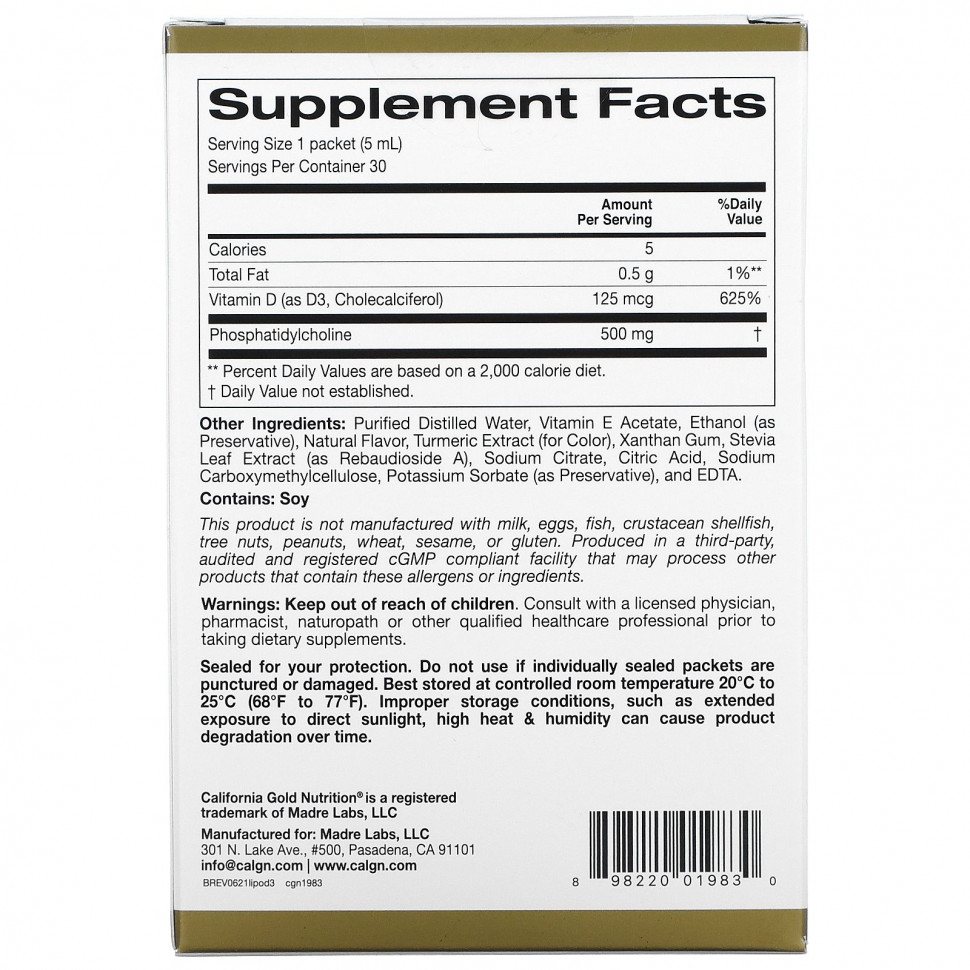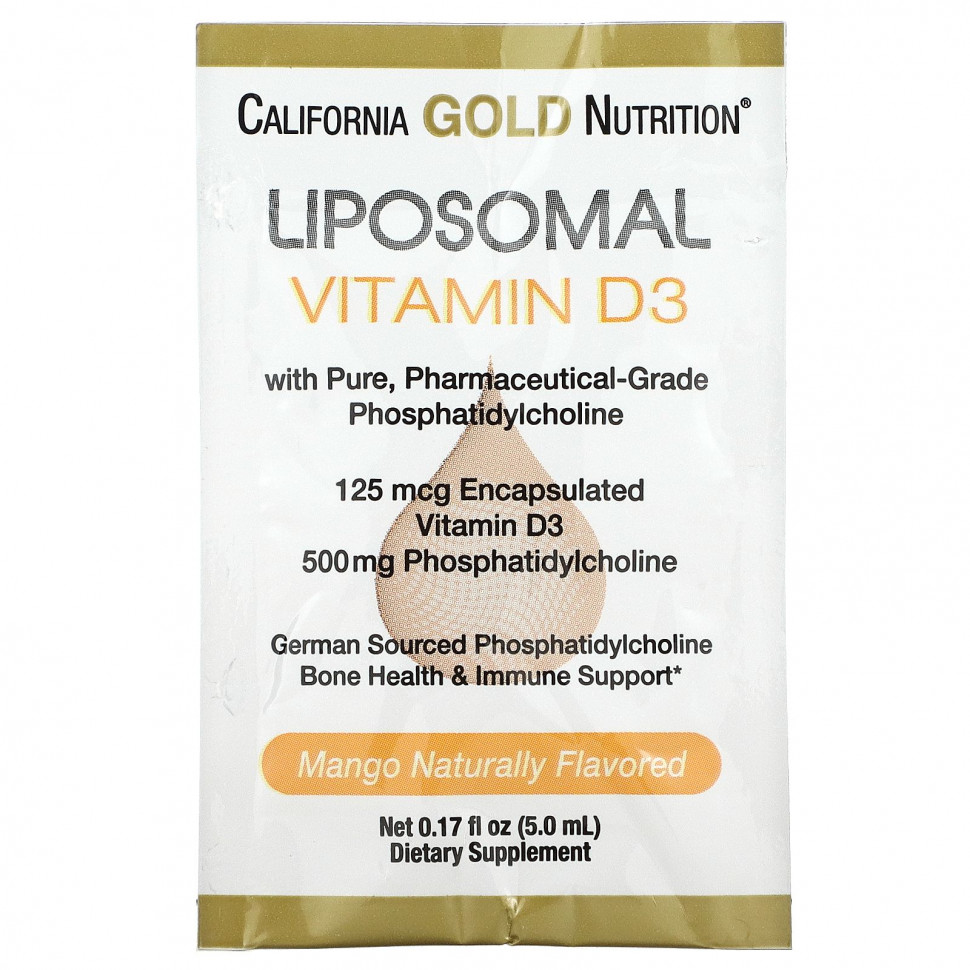 Липосомальный витамин D3 в пакетиках от California Gold Nutrition содержит инкапсулированный витамин D3, который создает защитный барьер, помогая улучшить всасывание в кишечнике и на клеточном уровне. Эта добавка с натуральным вкусом манго расфасована в отдельные пакетики, которые удобно брать с собой.