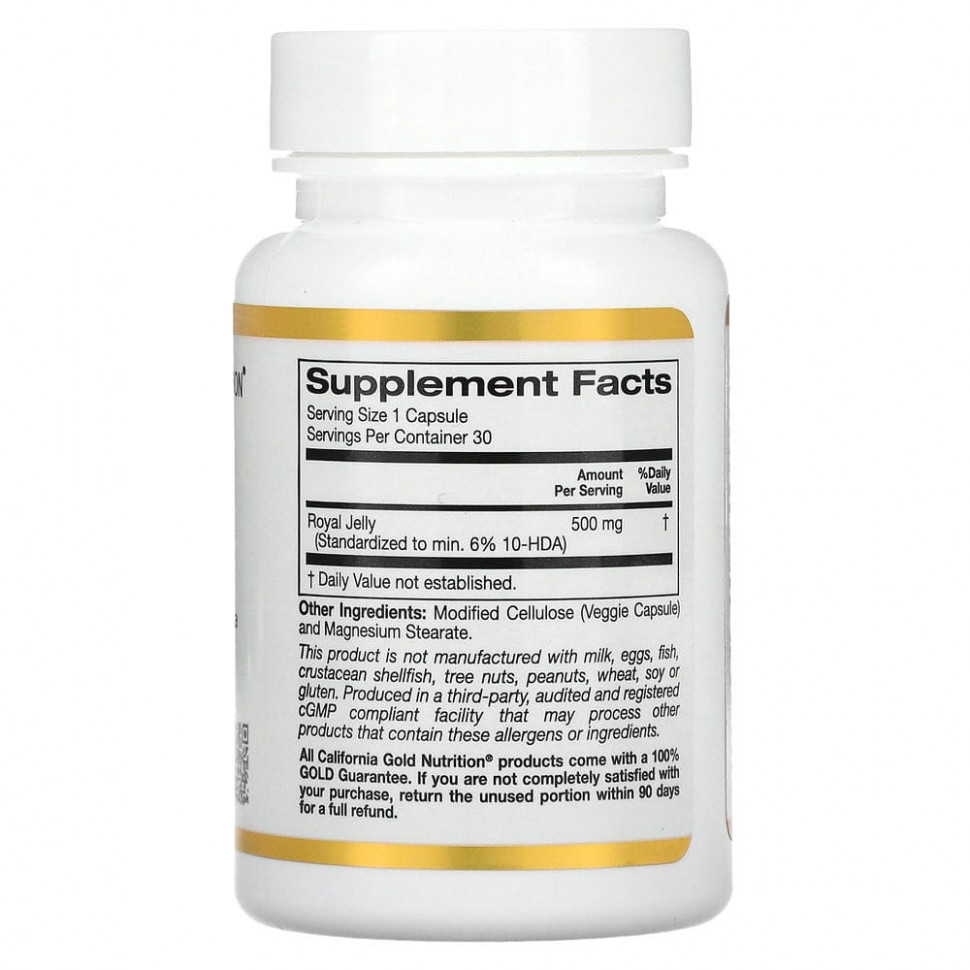 Одна капсула маточного молочка California Gold Nutrition содержит эквивалент 1500 мг свежего маточного молочка, доля 10-HDA в котором составляет не менее 6%.