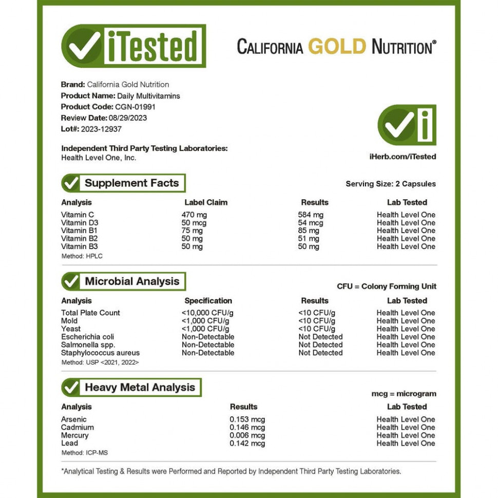 Мультивитамины для ежедневного приема California Gold Nutrition содержат уникальную высокоэффективную смесь из более чем 25 витаминов и микроэлементов. При условии приема согласно рекомендациям одной упаковки продукта хватает на три месяца.