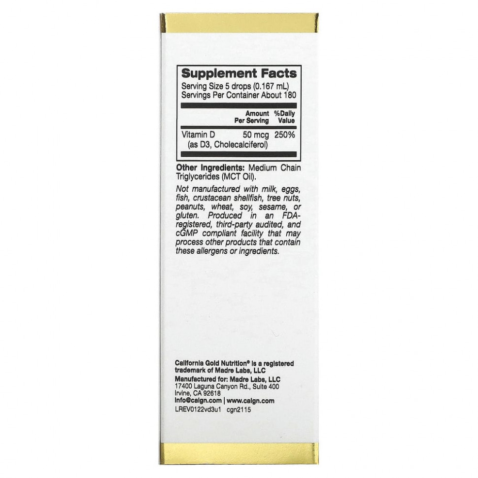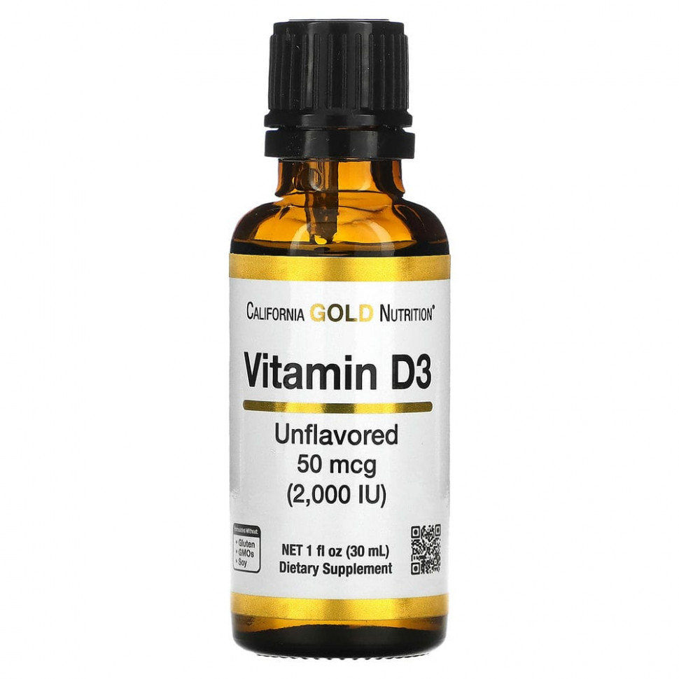 Витамин D3 от California Gold Nutrition содержит витамин D3 (холекальциферол) в виде удобной жидкой добавки. Он нейтральный на вкус, что позволяет добавлять его в любой напиток, а также не содержит глютена, ГМО и сои.