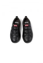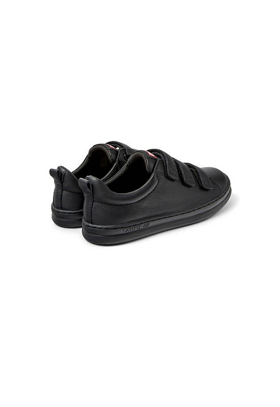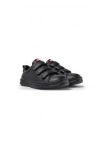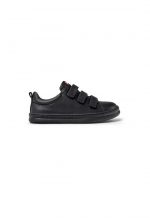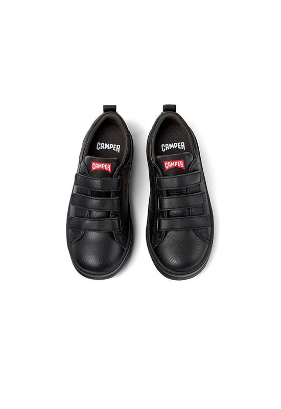 Black leather and textile kids’ sneakers with hook-and-loop closing system, OrthoLite® Recycled™ removable footbeds, and rubber outsoles.