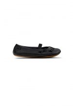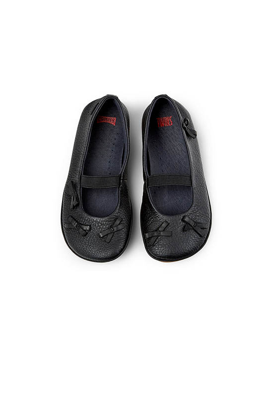Black leather kids’ ballerina with EVA footbed and recycled rubber outsoles (20% recycled).
