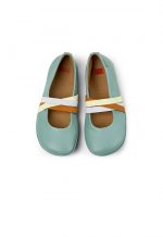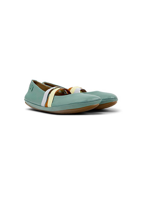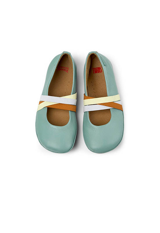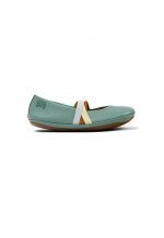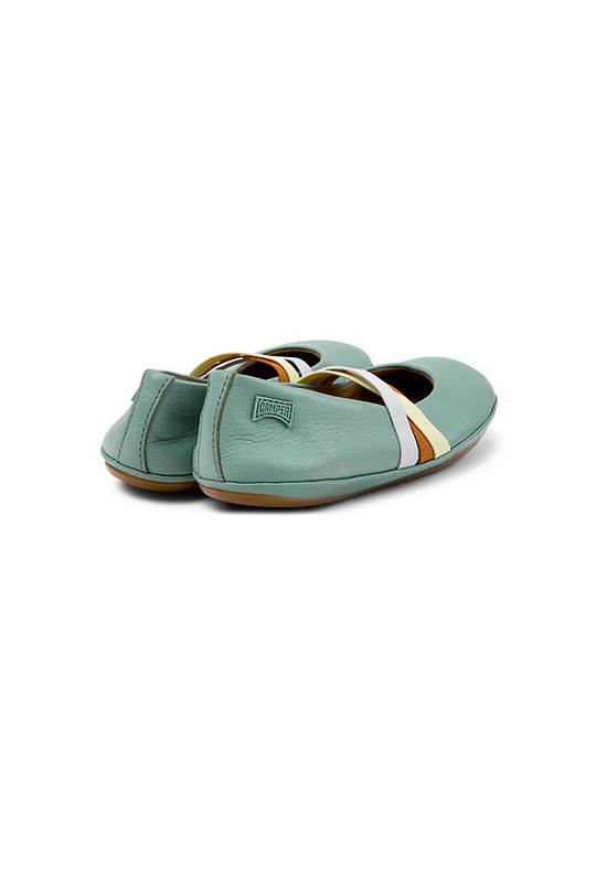 Green leather kids’ ballerina with EVA footbeds and recycled rubber outsoles (20% recycled).