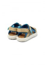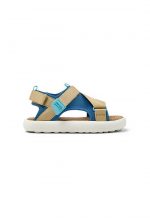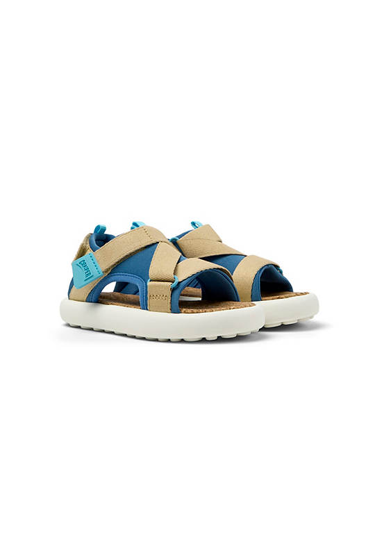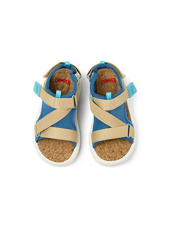 Multicolor recycled PET kids’ sandals with hook & loop system and EVA footbed and EVA outsoles.