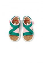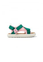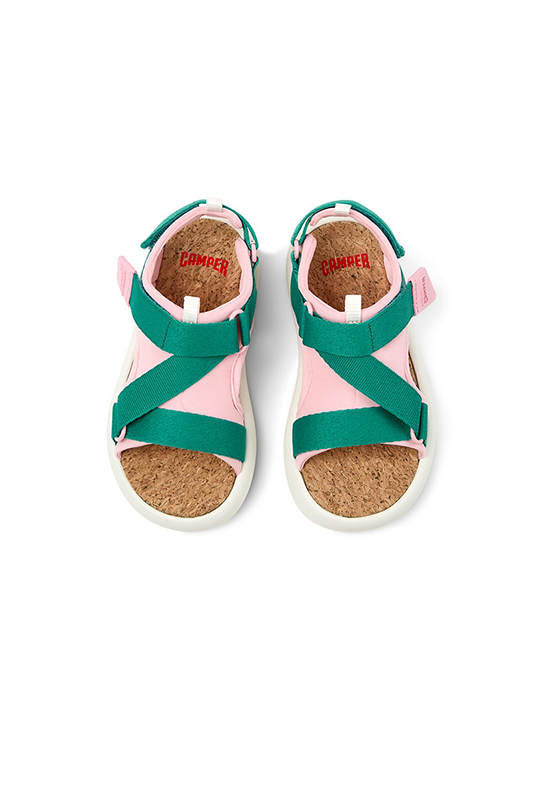 Multicolor recycled PET kids’ sandals with hook & loop System and EVA outsoles.