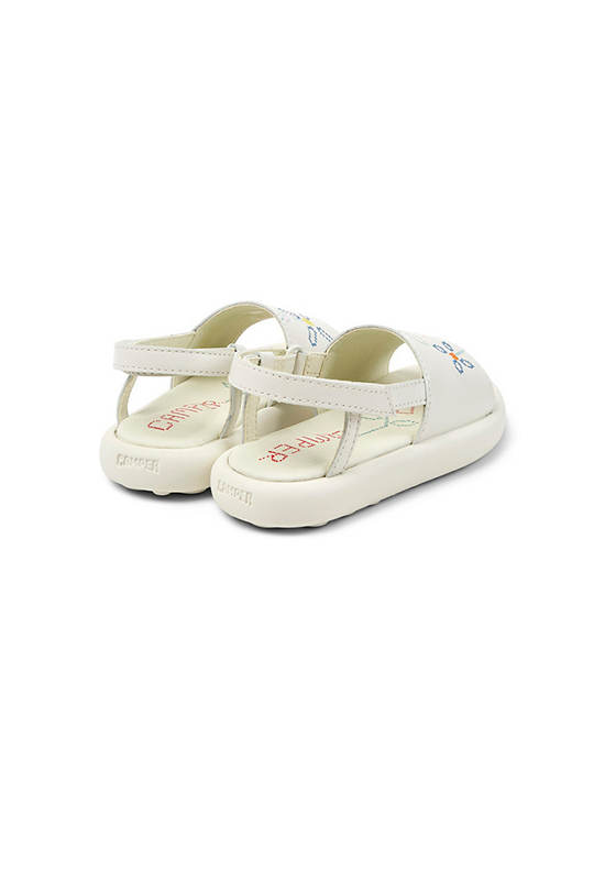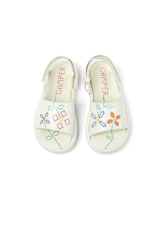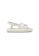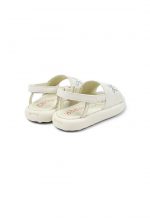 White leather kids’ sandal with hook & loop system, EVA footbed, and EVA outsoles.