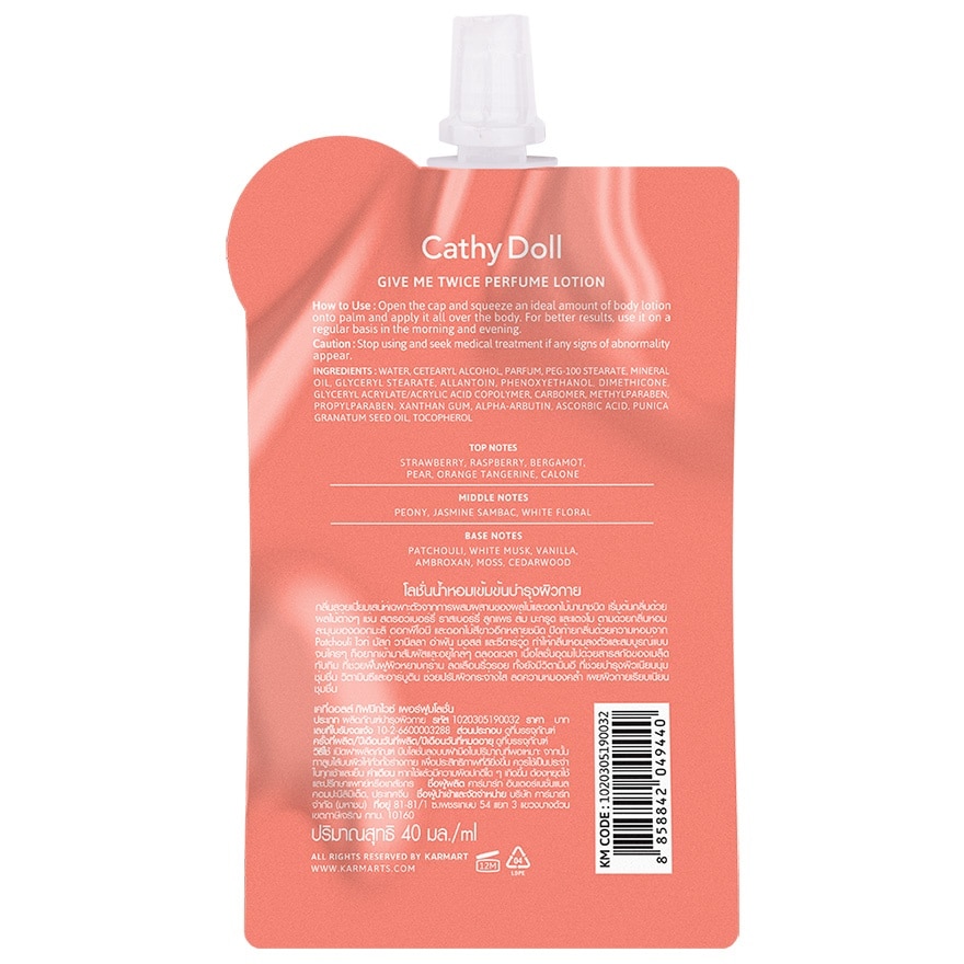Cathy Doll Give Me Twice Perfume Lotion A floral fruity perfume lotion that delivers a uniquely addictive fragrance It opens with a sparkling fruity cocktail of Strawberry Raspberry Pear Orange Bergamot and Watermelon accentuated by sophisticated floral notes of Jasmine Peony and White Flowers It finishes with a warm and woody aroma of Patchouli White Musk Vanilla Amber Moss and Cedarwood that enhances the user is beauty and allure attracting attention of everyone It also contains a blend of anti wrinkle and hydrating Pomegranate Seed Extract Vitamin E Vitamin C and Arbutin to boost elasticity and radiance for a smooth supple and pampered skin all day long.