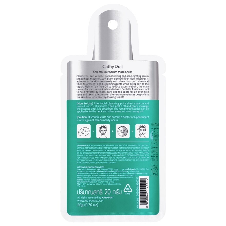 Cathy Doll Smooth Blur Serum Mask Sheet Clarify your skin with this pore shrinking and acne fighting serum sheet mask made of 100 percent plant derived fiber