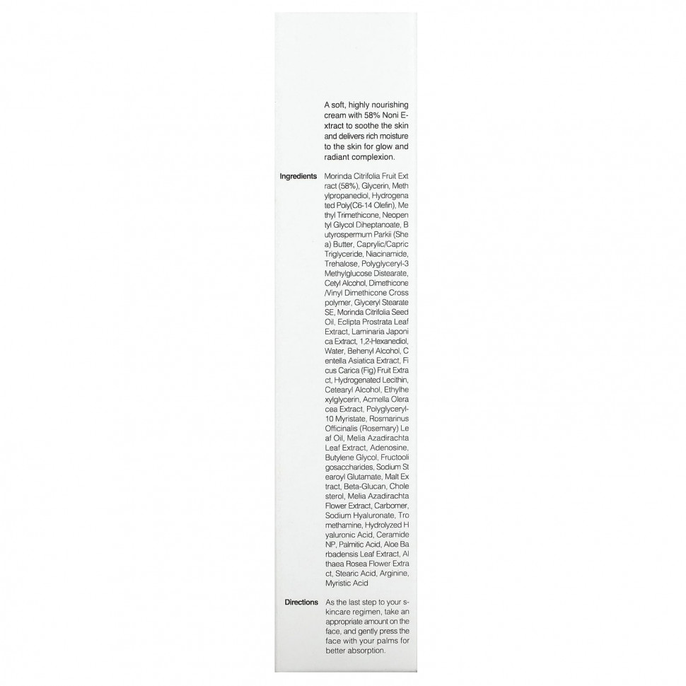 Мягкий, питательный крем с 58% экстрактом нони успокаивает кожу и насыщает ее влагой, придавая ей сияние и сияющий цвет лица.