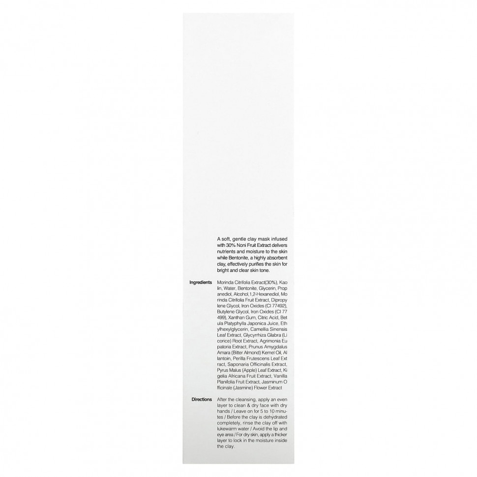 Экстракт Morinda citrifolia (30%), каолин, вода, бентонит, глицерин, пропандиол, спирт, 1,2-гександиол, экстракт плодов нони (Morinda citrifolia), дипропиленгликоль, оксиды железа (CI 77492), бутиленгликоль, оксиды железа (CI 77499), ксантановая камедь, лимонная кислота, сок березы плосколистной (Betula platyphylla japonica), этилгексилглицерин, экстракт листьев зеленого чая (Camellia sinensis), экстракт корня солодки (Glycyrrhiza glabra), экстракт репешка (Agrimonia eupatoria), Prunus amygdalus amara (горький миндаль) kemel oi, аллантоин, экстракт листьев периллы (Perilla ocymoides), экстракт мыльнянки лекарственной (Saponaria officinalis), экстракт листьев яблони (Pyrus malus), экстракт плодов кигелии (kigelia africana), экстракт ванили (Vanilla planifolia), экстракт цветков жасмина (Jasminum officinale).