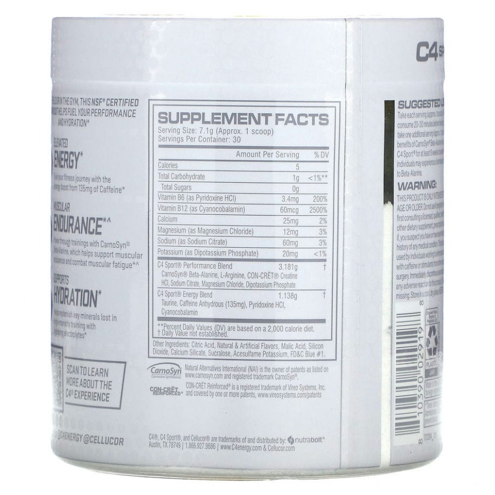 Прием комплекса C4 Sport за 30 минут до тренировки обеспечивает заряд энергии и концентрацию, чтобы максимизировать результаты вашей тренировки.