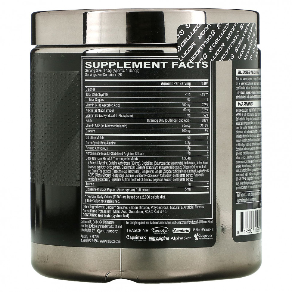 Каждая порция C4 ULTIMATE® SHRED содержит инновационную формулу ULTIMATE и матрицу SHRED. Эта смесь создана на основе клинически изученных ингредиентов, которые были специально отобраны за их способность поддерживать сжигание жира и метаболизм, улучшая результаты жиросжигающих тренировок.