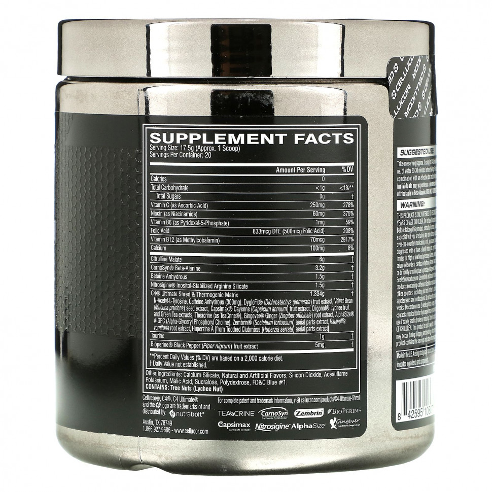 Каждая порция C4 ULTIMATE® SHRED содержит инновационную формулу ULTIMATE и матрицу SHRED. Эта смесь создана на основе клинически изученных ингредиентов, которые были специально отобраны за их способность поддерживать сжигание жира и метаболизм, улучшая результаты жиросжигающих тренировок.