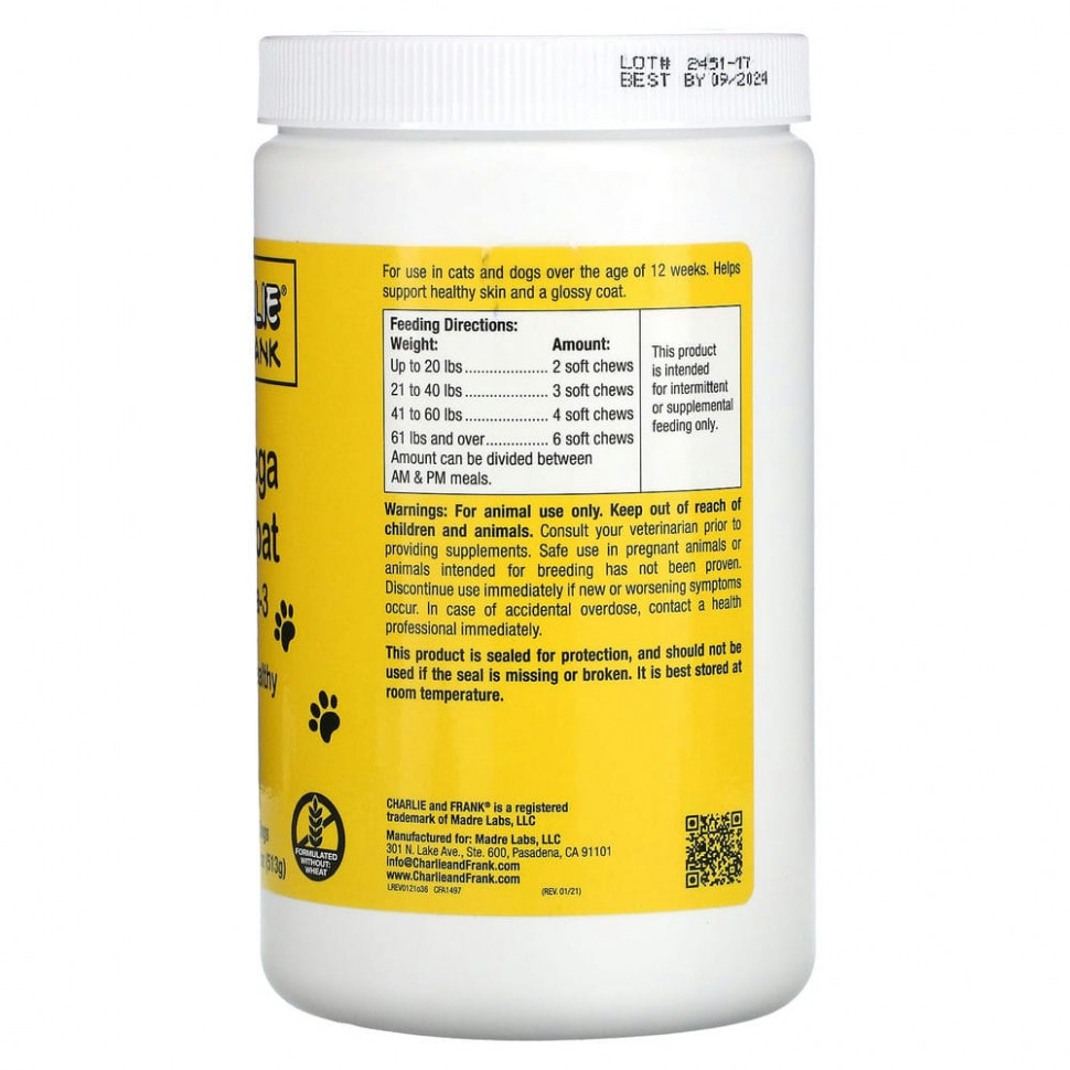 Charlie & Frank, омега для здоровья кожи и шерсти животных — мягкие жевательные добавки, разработаны для поддержания здоровья кожи и блеска шерсти. Сочетание надежных ингредиентов с вкусными пивными дрожжами, жиром лосося и натуральными ароматизаторами. Поддерживайте здоровье и мягкость шерсти своего пушистого члена семьи с помощью этих жевательных таблеток.