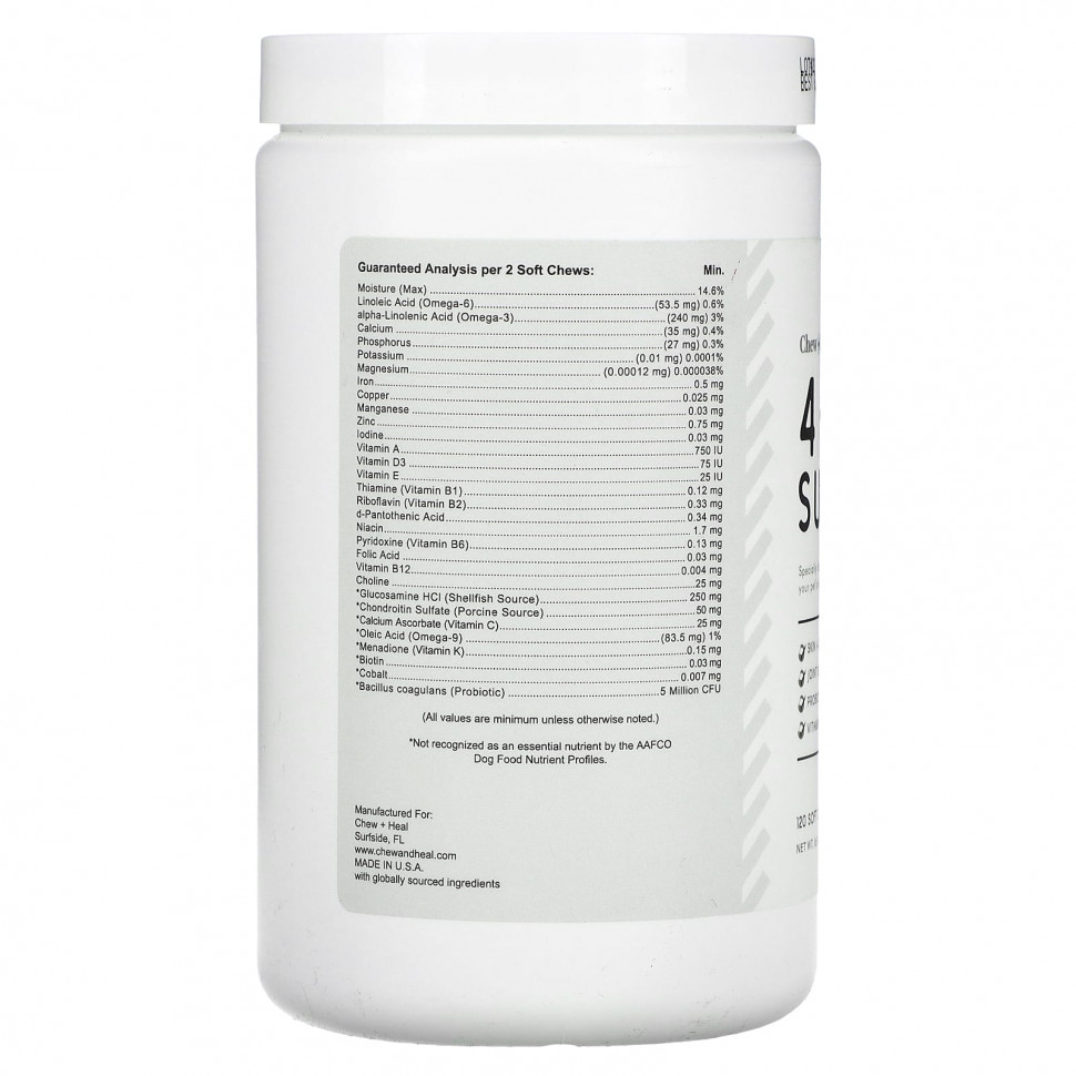 сухие пивные дрожжи, льняное семя, глицерин, сухой продукт из картофеля, лецитин, гидролизат из сушеных моллюсков, натуральный ароматизатор, вода, дикальций фосфат, рапсовое масло, мальтодекстрин, тапиоковый крахмал, добавленный витамин Е, битартрат холина, хондроитинсульфат, фруктоолигосахариды, сухой продукт ферментации аспергилла (Aspergillus oryzae), сухие ферментируемые остатки аспергилла черного (Aspergillus niger), сухой продукт ферментации триходермы (Trichoderma longibrachiatum), папайя, сухой продукт ферментации бактерий бациллус коагуланс (B. coagulans), сорбиновая кислота (консервант), аскорбат кальция (источник витамина C), смешанные токоферолы (консервант), растительное масло, пальмитат витамина A, лимонная кислота (консервант), биотин, сульфат цинка, добавленный ниацин, сульфат железа, добавленный витамин D3, пантотеновая кислота, комплекс менадиона натрия бисульфита, рибофлавин, добавленный витамин В12, пиридоксина гидрохлорид, тиамина мононитрат, сульфат марганца, йодид калия, карбонат меди, фолиевая кислота, карбонат кобальта, стеарат магния.