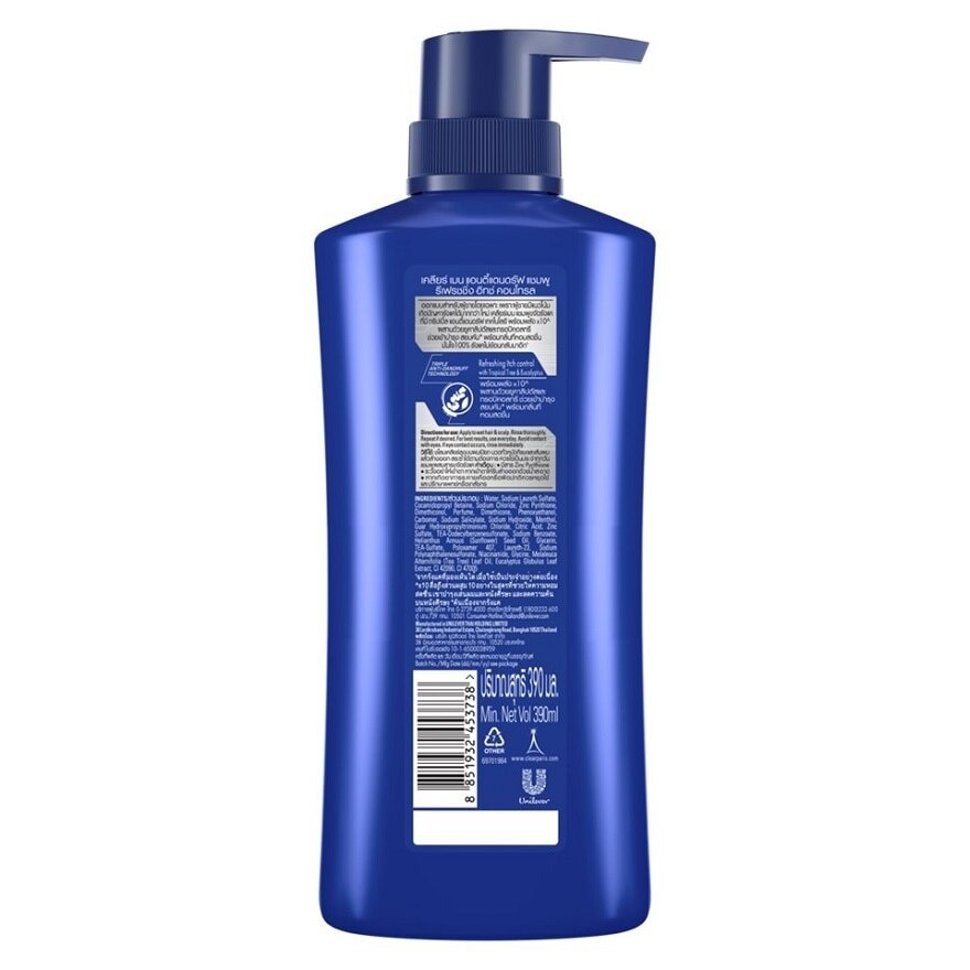Clear Men Shampoo Anti Dandruff Refreshing Itch Control With refreshing scent and itch worry free with Clear Men Refreshing itch control Engineered for Men. Because Men's scalp is more prone to dandruff. Clear Men with Triple Anti Dandruff Technology plues Taurine and Vitamin B3. Remove grease. Resist Dandruff. Prevent from dandruff. End recurring dandruff concern. With with Tropical Tree & Eucalyptus , give you refreshing scent and complete itch relief. Apply to wet hair & scalp. Rinse thoroughly. Repeat if desired. For best results use everyday. Avoid contact with eyes. If eye contact occurs, rinse immediately.
