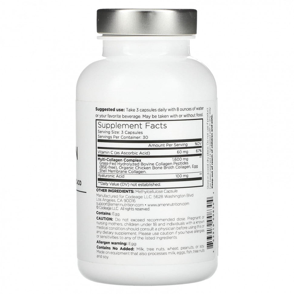Добавка Amen в виде мультиколлагеновых капсул содержит 5 типов коллагена, витамин С и гиалуроновую кислоту для создания комплексной и удобной формулы коллагена.