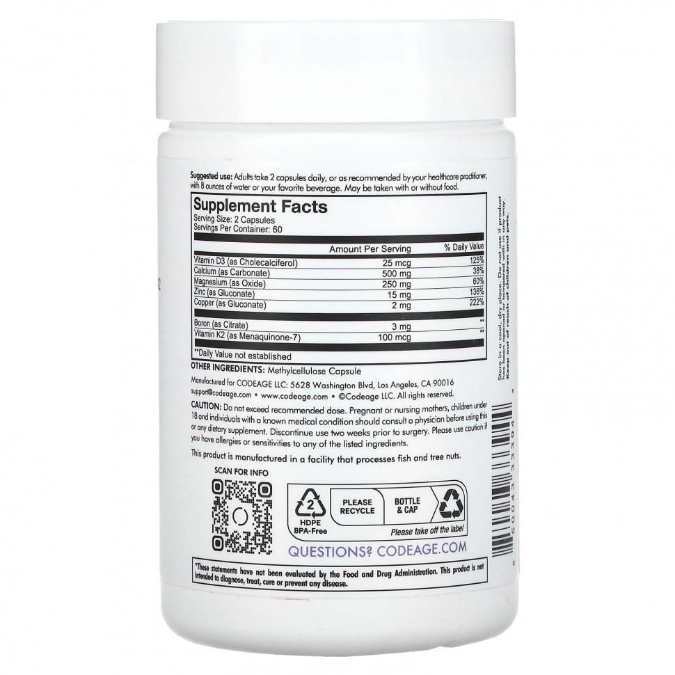 Капсульная добавка Codeage Calcium + содержит 500 мг кальция, магния, цинка, меди, бора, витамина D3 и витамина K2 в комплексной формуле, которая помогает поддерживать кости, зубы и иммунную систему в целом.