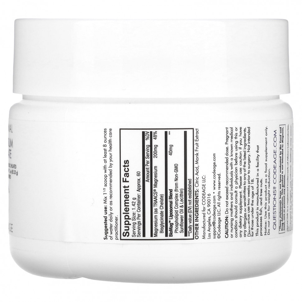 Порошковая добавка липосомального глицината магния Codeage содержит 200 мг хелата бисглицината магния TRAACS® на порцию и поставляется с запасом на 2 месяца. Этот усовершенствованный порошок магния также содержит липосомы, которые улучшают усвоение и оказывают успокаивающее и расслабляющее действие.