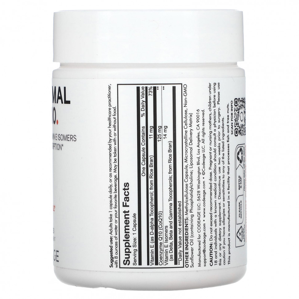 Codeage Liposomal CoQ10 — это комплексная формула с витамином E, коэнзимом Q10 и изомерами витамина E, которая помогает поддерживать здоровье сердечно-сосудистой системы и выработку энергии. Принимая всего 1 капсулу в день, эта формула CoQ10 поставляется с липосомальной доставкой, чтобы улучшить доставку и биодоступность.