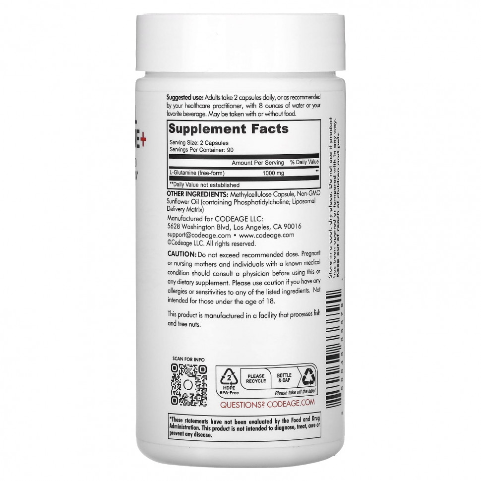 Капсульная добавка Codeage Liposomal L-глютамина содержит 1000 мг L-глютамина в свободной форме на порцию. Эта добавка с глютамином также поставляется с липосомальной системой доставки, которая помогает улучшить усвоение и биодоступность. Глутамин — это аминокислота, которая может поддерживать здоровье иммунной системы, мышц и кишечника.