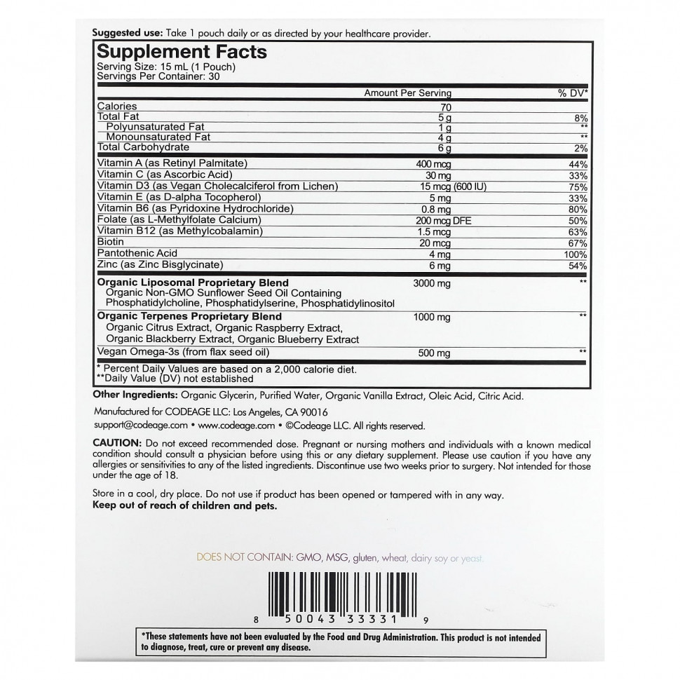 Мультивитаминная добавка для подростков Codeage Liquid Daily Teens в пакетиках содержит широкий спектр незаменимых витаминов и минералов для подростков от 12 лет, включая витамины A, C, D3, E, ряд витаминов группы B, фолат, веганские омега-3 жирные кислоты, биотин, пантотеновые кислоты. кислота, цинк и экстракты органических фруктов для поддержки здоровья иммунной системы.
