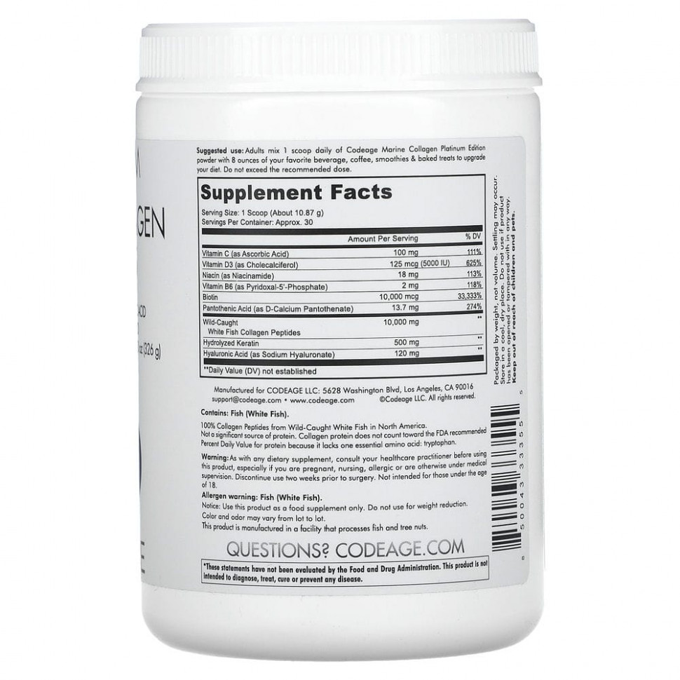 Codeage Wild Caught Marine Collagen Peptides Powder Platinum — это высококачественная коллагеновая добавка, изготовленная из морского коллагена, выловленного в дикой природе из холодных вод Северной Америки. Он содержит высокий уровень гидролизованного порошка рыбьего коллагена 1 и 3 типов, 10 000 мкг биотина, витамин C, витамин D3, витамин B6, ниацин, пантотеновую кислоту и гидролизованный кератин.