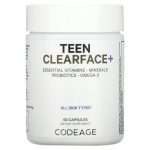 Добавка Codeage Teen Clearface содержит цельные витамины A, C, D3 & E содержит цинк, пантотеновую кислоту, L-лизин гидрохлорид и веганские омега-3. Формула также содержит пробиотики FloraFIT® и другие целевые штаммы пробиотиков, а также смесь трав для кожи.