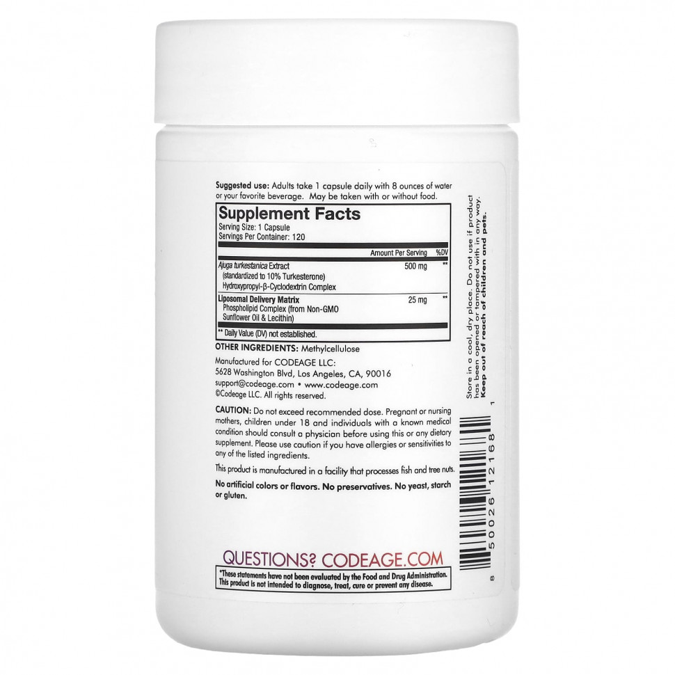 Codeage Liposomal Turkesterone — это высококачественная добавка, которая помогает поддерживать спортивные результаты и восстановление мышц. Каждая порция содержит 500 мг экстракта Ajuga turkestanica, стандартизированного до 10% туркестерона, и комплекса гидроксипропил-бета-циклодекстрин, а также поставляется с липосомальной доставкой для повышения биодоступности.