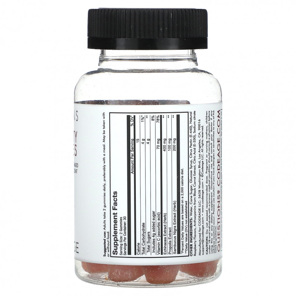 Веганские жевательные мармеладки со вкусом малины содержат 70 мг витамина С и смесь экстрактов эхинацеи, прополиса и бузины, а также экстракты бузины в мягкой и удобной форме.