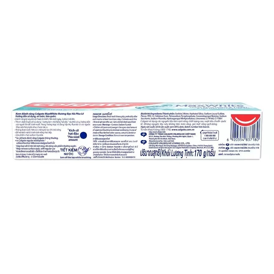 Colgate Toothpaste MaxWhite With the power of White Crystals throughout the toothpaste, this new formula helps whiten teeth in 14 days. MaxWhite and its Crystal Mint flavor, helps freshen up your breath whilst delivering a 10X longer lasting cooling effect to keep you confident throughout the day. — With White Crystal in strips — Heat to whiten within 14 days — Contain fluoride — Super Freshness for Xtra Confidence — With breakthrough cooling technology for intense cooling and super fresh experience — Help fights cavities vs. regular Colgate fluoride toothpaste. Colgate MaxWhite With the power of White Crystals throughout the toothpaste, this new formula helps whiten teeth in 14 days. MaxWhite and its Crystal Mint flavor, helps freshen up your breath whilst delivering a 10X longer lasting cooling effect to keep you confident throughout the day.
