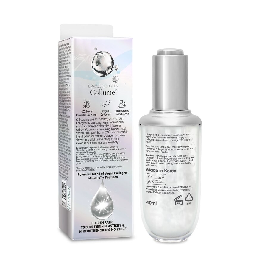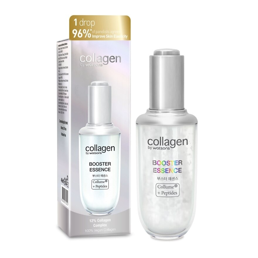 Collagen is vital for healthy, youthful skin. Collagen by Watsons helps improve skin moisturisation and elasticity. It features Collume, an award-winning biodesigned Vegan Collagen that is 20X more powerful than traditional Marine Collagen and was shown in a pilot clinical study to help increase skin firmness and elasticity. Collagen by Watsons Booster Essence is powerful blend of Vegan Collagen Complex, together with Peptides, Panthenol, Adenosine, Niacinamide and Hyaluronic Acid. Its golden ratio of formulation works to boost skin elasticity and strengthen the skin's moisture. Used regularly, it intensely nurtures and protects your skin. Promote paper packaging made with paper from responsibly managed forests, or with recycled content. Additionally, the paper used in this packaging is certified by FSC.