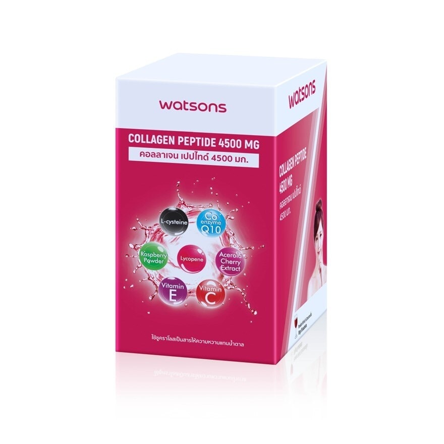 Collagen Peptide 4500 mg (Raspberry Powder, L-Cysteine, Coenzyme Q10 and Calcium Ascorbate Dietary Supplement Product) contains Raspberry powder, Fish collagen peptide, Collagen dipeptide, L-Cysteine, Acerola cherry extract, Calcium ascorbate, Coenzyme Q10, DL-alpha-tocopheryl acetate (50), Lycopene (10). Natural Identical Flavor (Raspberry flavor). Net weight 150 g/box (15 sachets). Promote paper packaging made with paper from responsibly managed forests, or with recycled content. Additionally, the paper used in this packaging is certified by FSC.