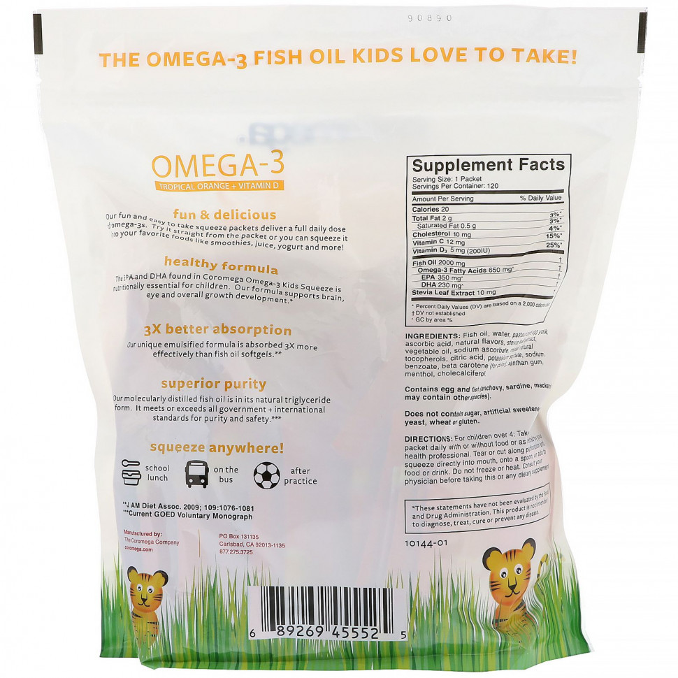 ЭПК и ДГК в составе препарата Coromega Omega-3 Kids Squeeze незаменимы для детей. Наше средство поддерживает нормальную работу головного мозга и глаз, а также общее развитие и рост.