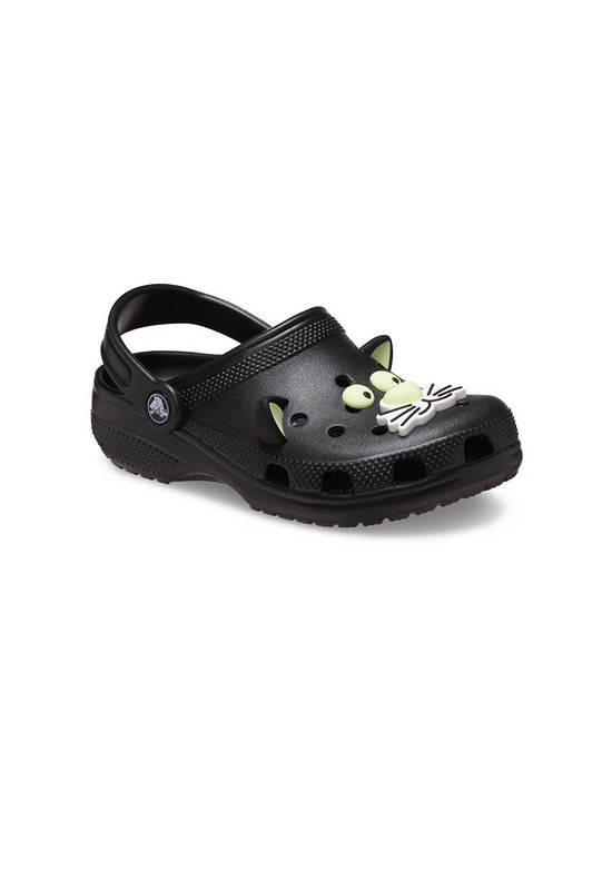 Little ones will love these CROCS Classic Glow-In-the-Dark Black Cat Clog Toddler Kids Casual Shoes with glow-in-the-dark cat eyes, ears and a nose. The fixed glow-in-the-dark cat features on a black clog give them spooky style, and Croslite™ foam construction keeps them light and easy to wear. Grounded in comfort, spiked with personality.