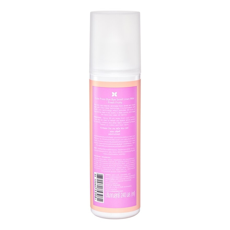 Cute Press Bye Bye Smell Linen Mist Fresh Fruity. This linen mist instantly eliminates food sweat and musty odor with Odor Clear technology. It is formulated with Scent Lock technology which provides 48 hours of long-lasting fresh fruity scent. It dries quickly and does not leave any stain on fabrics.Tested on cotton and linen fabric.Cute Press Bye Bye Smell Linen Mist Fresh Fruity Spray 30 cm away from your clothes. It can also be used to refresh any space and is perfect for carpets curtains and other fabric covered furniture.