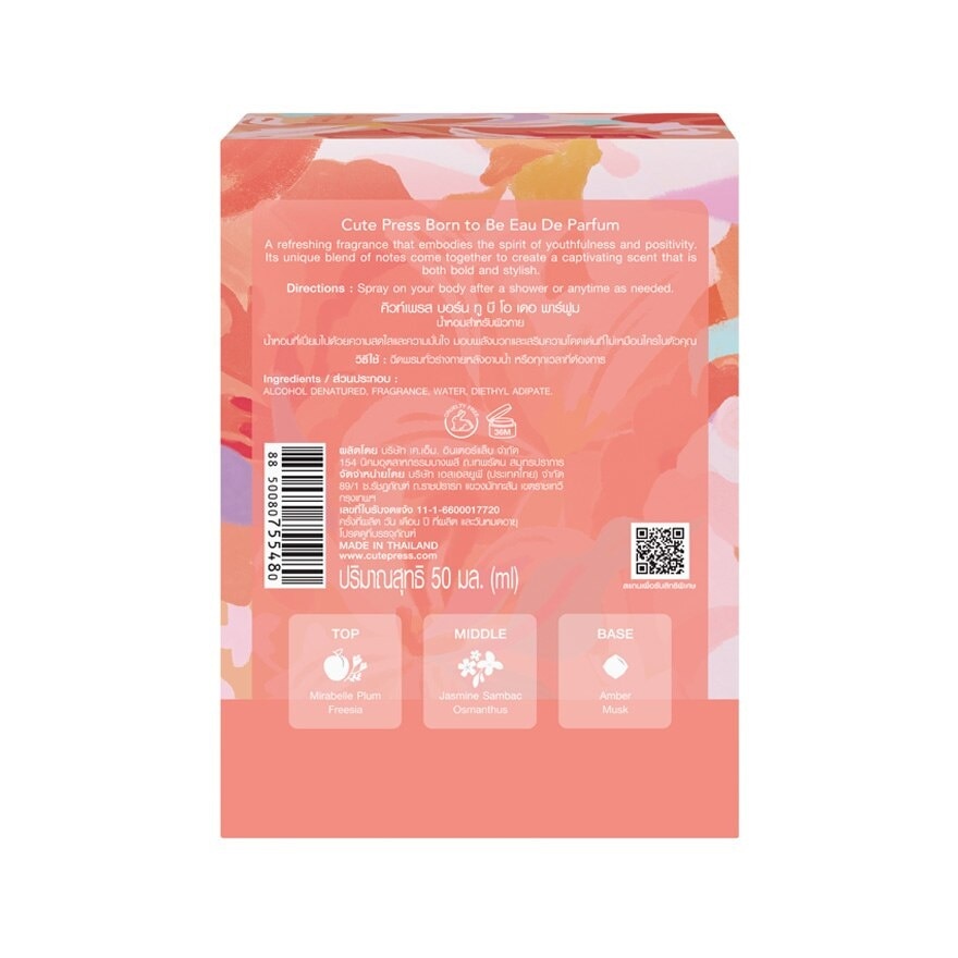 Cute Press The Muse Born To Be Eau de parfum 50 ml. A refreshing fragrance that embodies the spirit of youthfulness and positivity. Its unique blend of notes come together to create a captivating scent that is both bold and stylish. Floral perfumes in various styles that represent a variety of unique charms. Make a good first impression And enhance confidence throughout the day with a fragrance that lasts for 8 hours. Cute Press The Muse Born To Be Eau de parfum product usage spray on your body after a shower or anytime as needed.
