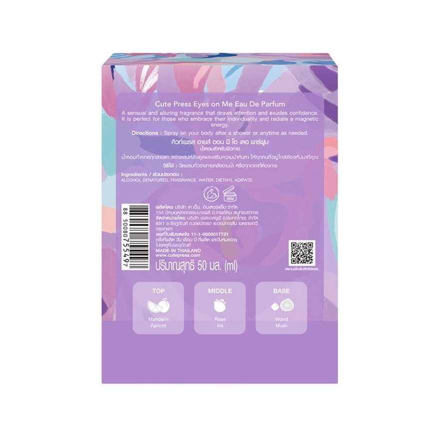Cute Press The Muse Eye On Me Eau de parfum 50 ml. A sensual and alluring fragrance that draws attention and exudes confidence. It is perfect for those who embrace their individuality and radiate a magnetic energy. Floral perfumes in various styles that represent a variety of unique charms. Make a good first impression And enhance confidence throughout the day with a fragrance that lasts for 8 hours. Cute Press The Muse Eye On Me Eau de parfum product usage spray on your body after a shower or anytime as needed.