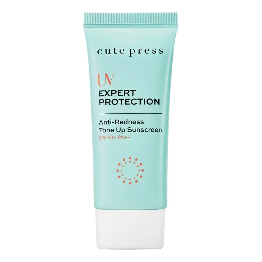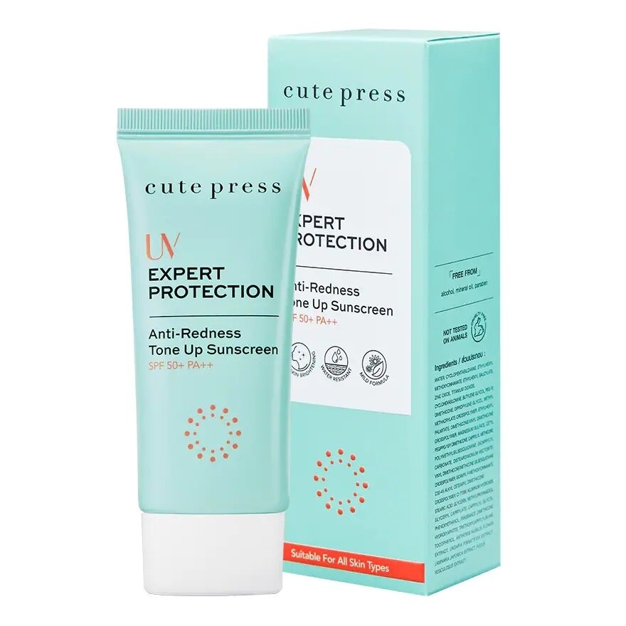 Cute Press UV Expert Protection Anti Redness Tone UP Sunscreen SPF 50+ PA++ This multi-tasking Tone Up Sunscreen not only protects your skin from UV rays but also instantly blurs redness, blemishes and enlarged pores, leaving you with smooth and glowing skin. Its color-correcting mint shade blends beautifully with all skin tones and brightens skin all day long. It has a light texture that feels ultra comfortable and a soft matte finish that leaves your skin looking fresh with 12 hours of oil control. Formulated with chamomile extract to soothe your skin after sun exposure and deep sea minerals to lock in moisture. Suitable for all skin types.