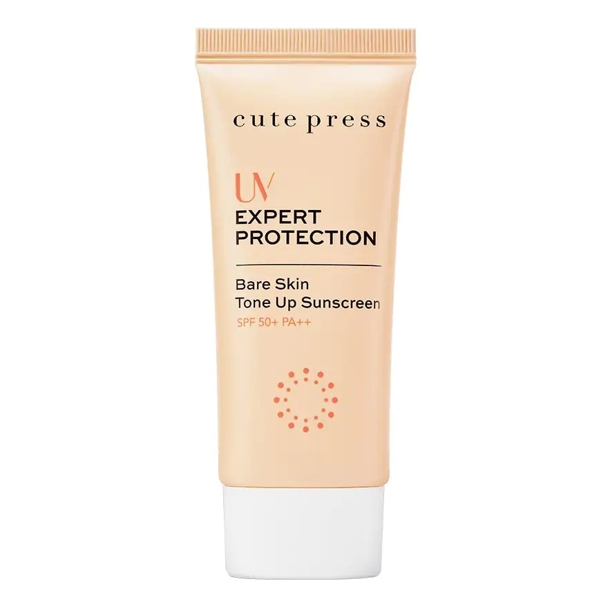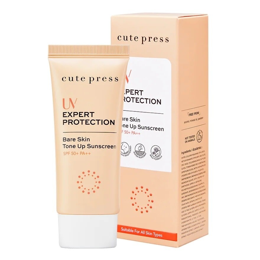 Cute Press UV Expert Protection Bare Skin Tone UP Sunscreen SPF 50+ PA++ This multi-tasking Tone Up Sunscreen not only protects your skin from UV rays but also instantly creates a more even skin tone with less visible pores, leaving you with smooth and healthy looking skin. Its natural beige shade blends beautifully with all skin tones and subtly brightens skin all day long. It has a light texture that feels ultra comfortable and a soft matte finish that leaves your skin looking fresh with 12 hours of oil control. Formulated with chamomile extract to soothe your skin after sun exposure and deep sea minerals to lock in moisture. Suitable for all skin types.