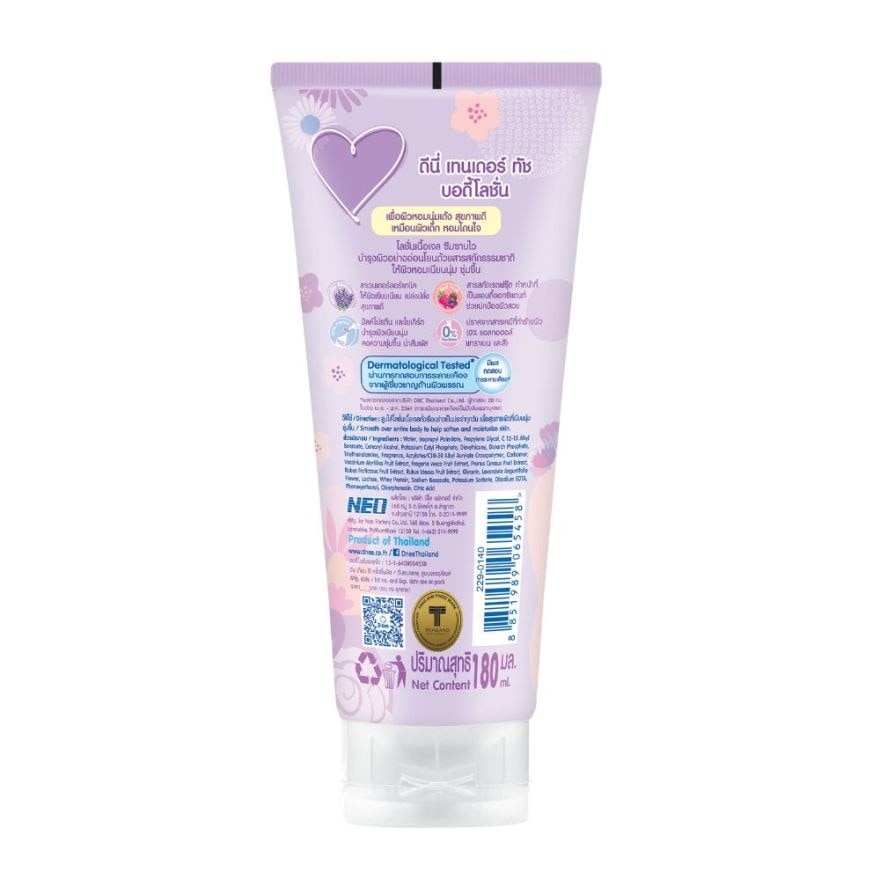 D-nee Tender Touch Body Lotion for fragrant, soft, bouncy, healthy skin like baby’s skin. It smells amazing. Gel lotion, absorbed quickly, gently nourishes the skin. With natural extracts Make the skin moisturized and glowing. Organic lavender makes the skin smooth, radiant, and healthy. Redfruit extract acts as an anti-oxidant. Helps protect beautiful skin Milk protein and yogurt nourish the skin, making it smooth and soft. Remains moist and pleasant to the touch Free from chemicals that harm the skin 0% alcohol, parabens and dyes.