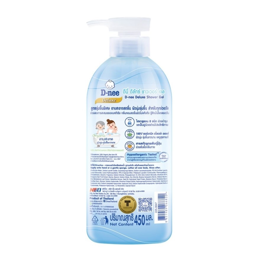 D-nee Deluxe Shower Gel Special moisturizing shower gel, cleans thoroughly, helps reduce the accumulation of bacteria, has a refreshing scent, does not dry the skin, combines 8 types of Hyaluronic, Aloe Vera Oil and Japanese persimmon extract, helps nourish and restore the skin effectively, leaving the skin soft and moisturized for a long time, looking healthy, confident all day long. of Hyaluronate help nourish and revitalize the skin effectively. 100% Organic Aloe Vera Oil, soft skin, long-lasting moisture, looks healthy. Japanese persimmon extract Helps stop body odor 100% cleaning agent Has a natural origin Hypoallergenic Tested.