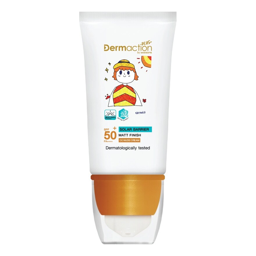 Dermaction Plus by Watsons Advanced Sun Solar Barrier CC Nude Cream SPF50+ PA++++. This lightweight make-up base CC nude cream with water resistant formula is a broad spectrum sunscreen to protect the skin from harmful rays, namely UVA, UVB, HEV (Blue Light) and IR rays, the major causes of dark spots, skin damage and premature ageing. Double IRtech synergises the two technologies of Elix-IR and UV-IR Block DTCP to maximise IR photoageing protection, improve skin firmness and elasticity, and minimise damage from UV and IR rays. HEVshield works as a coating film to protect your skin from UV rays and High Energy Visible Light, which damage the skin, trigger premature signs of ageing and cause uneven skin tone and skin damage. DermisGuard strengthens the skin barrier function and provides deep hydration for the skin. CollaBoost helps promote skin elasticity and reduce the appearance of wrinkles. Witch Hazel Extract has antioxidant properties to protect your skin from pollution, tighten pores and control oil. Photogenic Scattering helps reflect light, making your skin look bright and radiant. Free from Oxybenzone, Octinoxate, Octocrylene, Homosalate, 4-methylbenzylidene Camphor, PABA, Parabens, Triclosan, Nano-sized Zinc/Titanium. Ingredient you can trust with a reduced environmental impact. This product was formulated without over 20 unwanted ingredients. Additionally, out of the total palm oil/derivatives, this formulation contains more than 50 of certified sustainable palm oil/derivatives. The tube is also made with 25 recycled plastic and the paper used in this box packaging is certified by FSC.