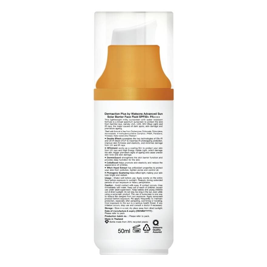 Dermaction Plus by Watsons Advanced Sun Solar Barrier Face Fluid SPF50+ PA++++. This lightweight milky sunscreen with water resistant formula is a broad spectrum sunscreen to protect the skin from harmful rays, namely UVA, UVB, HEV (Blue Light) and IR rays, the major causes of dark spots, skin damage and premature ageing. Double IRtech synergises the two technologies of Elix-IR and UV-IR Block DTCP to maximise IR photoageing protection, improve skin firmness and elasticity, and minimise damage from UV and IR rays. HEVshield works as a coating film to protect your skin from UV rays and High Energy Visible Light, which damage the skin, trigger premature signs of ageing and cause uneven skin tone and skin damage. DermisGuard strengthens the skin barrier function and provides deep hydration for the skin. CollaBoost helps promote skin elasticity and reduce the appearance of wrinkles. Free from Oxybenzone, Octinoxate, Octocrylene, Homosalate, 4-methylbenzylidene Camphor, PABA, Parabens, Triclosan, Nano-sized Zinc/Titanium. Ingredient you can trust with a reduced environmental impact. This product was formulated without over 20 unwanted ingredients. Additionally, out of the total palm oil/derivatives, this formulation contains more than 50 of certified sustainable palm oil/derivatives. The bottle is also made with 25 recycled plastic and the paper used in this box packaging is certified by FSC.